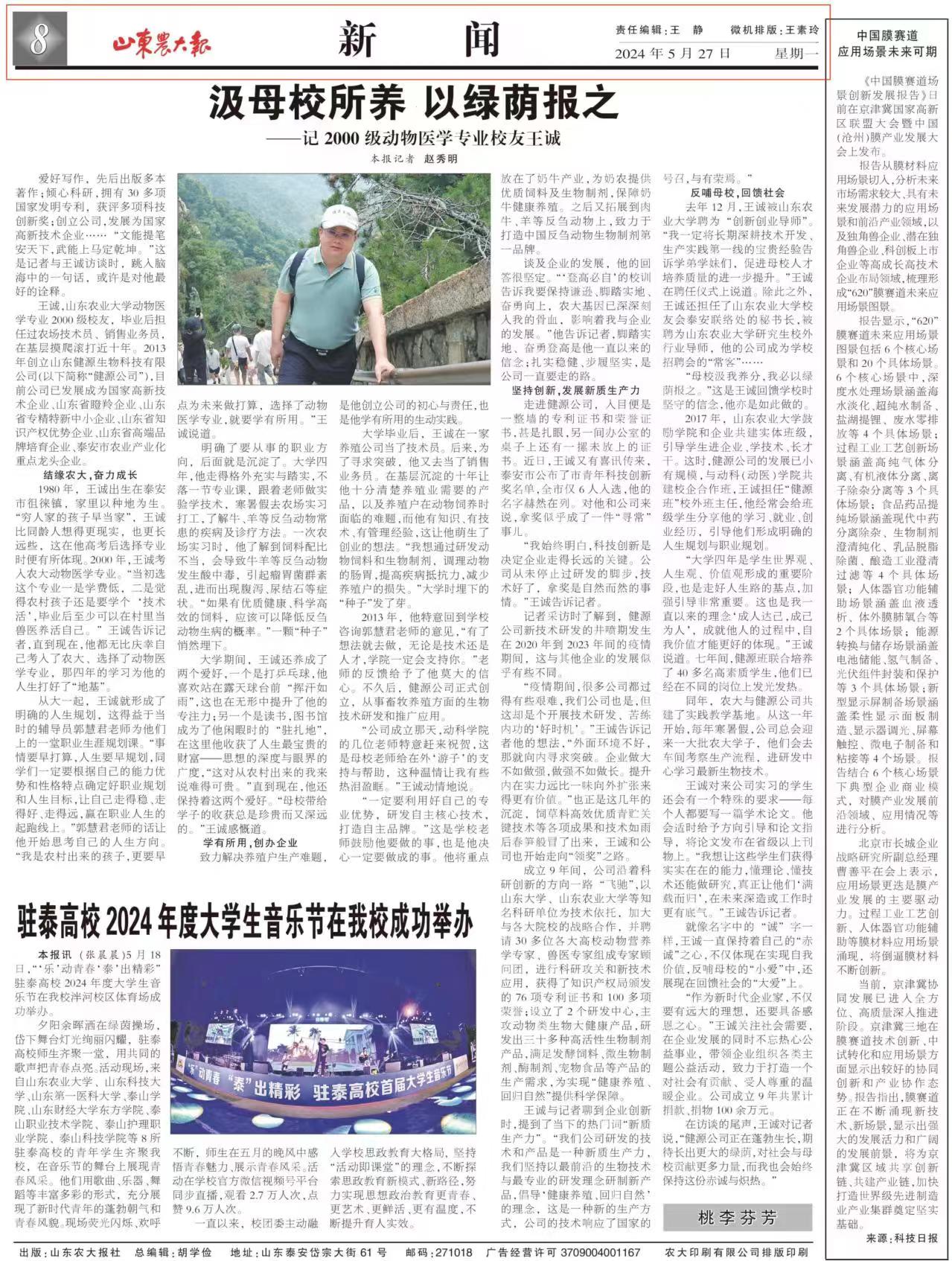 日前,王誠董事長作為山東農(nóng)業(yè)大學校友接受《山東農(nóng)大報》桃李芬芳欄目采訪。報道發(fā)表在《山東農(nóng)大報》第...